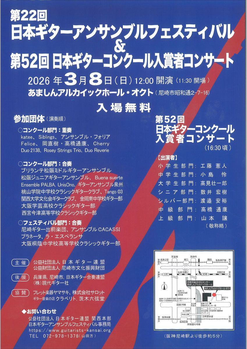 第22回日本ギターアンサンブルフェスティバル : 12時開演 第52回日本ギターコンクール入賞者コンサート : 16時30分開演(予定) 入賞者コンサート 出演予定者 小学生部門 : 工藤 憲人 中学生部門 : 小島 怜 大学生部門 : 高見壮一郎 シニア部門 : 数井 宏樹 シルバー部門 : 渡邊 安裕 中級部門:高橋 通康 上級部門:山本 譲 (敬称略) 場 所: あ ましんアルカイックホール・オクト (阪 神尼崎駅 北東に立体遊歩道で徒歩約5分) 料 金:無料 主催:公益社団法人日本ギター連盟・公益財団法人尼崎市文化振興財団 後援:兵庫県、尼崎市、日本ギター合奏連盟、(株)現代ギター社 協賛:フレット楽器ヤマサキ、株式会社サロット ギター音楽の店 クラベリト、茨木六弦堂 |